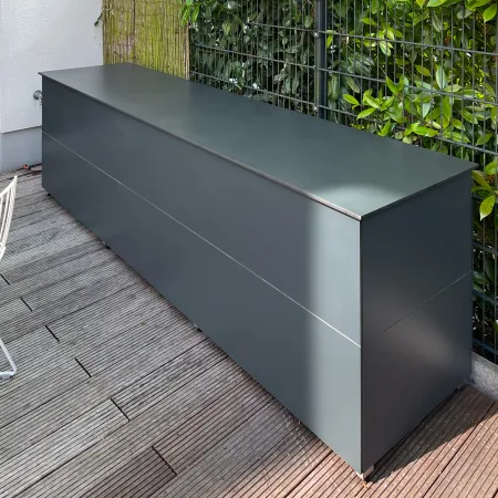 In comparison, our garden box made of HPL is so robust that you can even sit on it. It defies all weather conditions, is UV-resistant, maintenance-free, weatherproof, waterproof and insensitive to heat. In addition, it offers protection against hail and is shock and scratch resistant, so it can even take a football without a direct dent. You have to worry more about the football... Get your own impression of our favourite material HPL and order our HPL colour sample set free of charge.