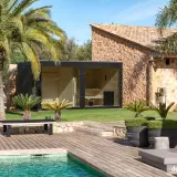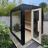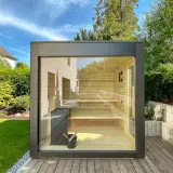The garden sauna is not only a visual highlight, but also technically sophisticated. With high-quality, natural materials and a weatherproof construction, it is equipped for all seasons. The combination of warm wooden surfaces inside and the robust HPL shell ensures that you can relax in any season. And even in the cooler months, the sauna with its view of the greenery offers a cosy, warm retreat that turns the garden into a year-round feel-good place.