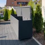 ¡Todo balcón merece una mejora elegante y práctica! Nuestra caja de jardín de diseño no solo ofrece un elegante espacio de almacenamiento para cojines, colchonetas y almohadillas, sino que también destaca por su acabado impermeable, resistente a la lluvia y a los rayos UV, ideal para todo el año. La tapa abatible con resorte de gas integrado garantiza una apertura y cierre sin esfuerzo, por lo que guardar y sacar objetos es un juego de niños.
