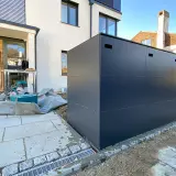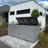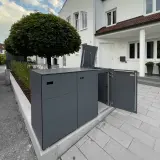 Un jardín delantero bien cuidado suele ser la primera impresión que los visitantes y transeúntes tienen de su hogar. Sin embargo, los contenedores de basura rara vez encajan en esta imagen y pueden resultar molestos. Nuestra elegante caseta para contenedores de basura es la solución: garantiza que los contenedores estén bien guardados y, al mismo tiempo, se convierten en un elemento llamativo. Nuestra caseta para cubos de basura, en un moderno tono gris, se integra discretamente en diferentes zonas exteriores, ya sea junto al garaje, junto a la pared de la casa o independiente. De este modo, incluso el jardín delantero con cubos de basura se convierte en un conjunto armonioso que combina funcionalidad y estética.