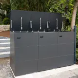 Fabricada en HPL de alta calidad, la caseta para cubos de basura se caracteriza por su resistencia a la intemperie y su protección contra los rayos UV, por lo que mantiene su color y forma de forma permanente sin necesidad de mantenimiento. Su diseño bien pensado con dos accesos es especialmente práctico: por un lado, una puerta frontal ofrece un cómodo acceso para sacar y llenar los cubos y, por otro, una tapa abatible permite un fácil acceso desde arriba, ideal para una rápida eliminación de residuos. Los elementos de ventilación integrados garantizan una buena circulación del aire y minimizan los olores desagradables. Así, nuestro casetón para cubos de basura es una solución especialmente práctica y estética que revaloriza el exterior y, al mismo tiempo, cumple todos los requisitos de una gestión moderna de residuos.