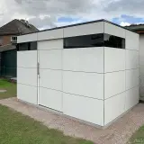 Cobertizo para bicicletas, caseta para cubos de basura y cobertizo para herramientas, todo en uno: ¡esta caseta de jardín XXL ofrece claramente un espacio de almacenamiento XXL! Diseñada como un cobertizo independiente, ofrece, gracias a su puerta corredera con cerradura, una opción de almacenamiento segura para todo lo que es mejor no dejar por ahí tirado en el jardín delantero. Así se ahorra tener que cerrar con llave las bicicletas, guardar las herramientas de jardín y fabricar soluciones de almacenamiento individuales y resistentes a la intemperie. Con un tamaño así, nuestra caseta de jardín también se utiliza a menudo como taller, en el que hay espacio para un banco de trabajo, un contenedor con ruedas o un panel para herramientas. Las ventanas empotradas proporcionan suficiente luz y, con la planificación adecuada, también se puede instalar electricidad en la caseta de jardín. De este modo, los proyectos de jardinería y bricolaje pueden continuar cómodamente incluso cuando llueve. Las reparaciones de bicicletas, motocicletas, scooters y patinetes también se pueden realizar sin problemas en una caseta de jardín tan grande.