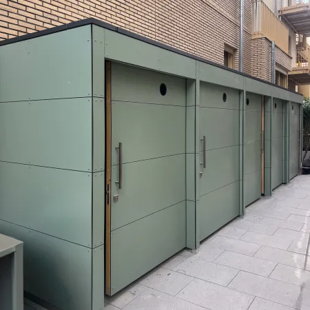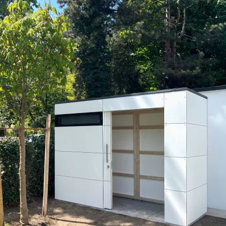 Das kubistische Gerätehaus @gart zwei mit wetterfester HPL-Fassade ist ein wahres Raumwunder.
