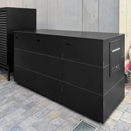 L'incasso moderno per 2, 3 o 4 bidoni della spazzatura realizzato in resistente HPL per bidoni della spazzatura da 120 litri e 240 litri. Fornito di serie con coperchio a ribalta e disponibile opzionalmente con una cassetta pacchi integrata.