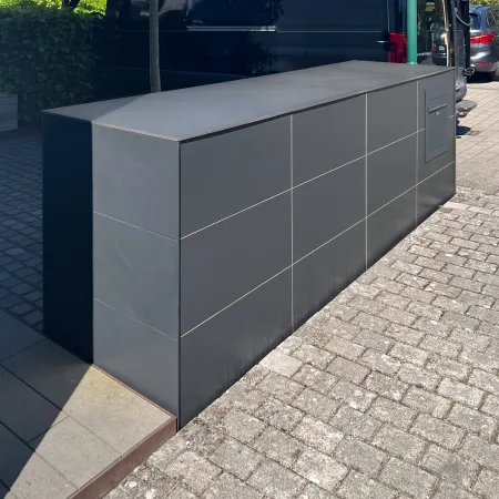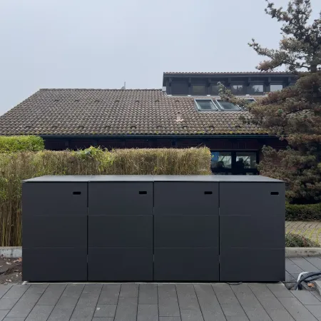 Il box @hide per bidoni della spazzatura può essere adattato in modo ottimale ai dettagli della Sua architettura, con oltre 200 colori e decori. Il laminato per esterni è resistente ai raggi UV e non ha bisogno di essere verniciato. Ecco perché gli alloggiamenti e le casette per i bidoni della spazzatura vengono utilizzati soprattutto nei complessi residenziali. L’acciaio inox e l’HPL rendono l’alloggiamento per bidoni della spazzatura @hide estremamente resistente agli agenti atmosferici.