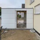 Questa casetta da giardino di design a Capellen, in Lussemburgo, è stata realizzata con una profondità speciale di 1,80 m, adattata esattamente allo spazio disponibile. In questo modo i percorsi tra la casa e la casetta da giardino rimangono sufficientemente ampi e lo spazio di stoccaggio disponibile viene sfruttato in modo ottimale. La casetta da giardino si integra armoniosamente nell'ambiente circostante e sfrutta perfettamente le condizioni locali.