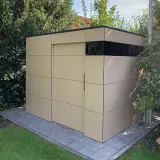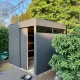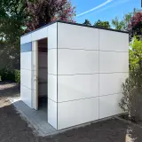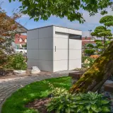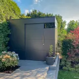 La nostra casetta da giardino compatta si adatta a qualsiasi spazio ridotto, persino al centro dell'orto. Con una superficie di 3 x 2 metri, offre uno spazio di stoccaggio sorprendentemente ampio per tutto ciò che non deve rimanere all'aperto, come attrezzi da giardinaggio, prodotti per la cura delle piante o per la manutenzione della piscina. La facciata in HPL color antracite ha un aspetto piacevolmente sobrio e moderno. Ideale per chi ha grandi progetti in uno spazio ridotto.