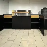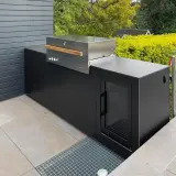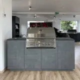 Per grigliare senza occupare troppo spazio abbiamo sviluppato questa piccola cucina da esterno. Il robusto barbecue da incasso Napoleon con 4 bruciatori e un backburner è stato inserito in modo tale che la superficie di cottura si trovi all'altezza del piano di lavoro. Il posizionamento centrale consente di sfruttare appieno l'altezza del corpo esterno. Qui c'è spazio sufficiente per riporre accessori per il barbecue, cuscini per sedie, tovagliette e molto altro ancora. La bombola del gas è collocata nel corpo centrale direttamente sotto il barbecue ed è facilmente accessibile. Il corpo resistente alle intemperie in HPL con decorazione grigia non solo è elegante, ma è anche estremamente robusto e quindi non solo è perfettamente attrezzato per resistere agli agenti atmosferici, ma è anche progettato per una vera e propria "grigliata pratica".