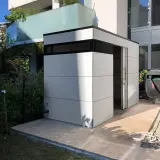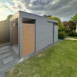 Design Gartenhaus nach Maß mit schräger Rückwand: b 300 cm x links 217 cm x rechts 266 cm x h 245 cm