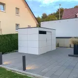 Beidseitig begehbares, großes Design Gartehnaus nach Maß. Die zwei Schiebetüren ermöglichen eine maximal flexible Nutzung. So können beispielsweise Fahrräder und Tonnen von der Seite des Vorgartens her untegestellt werden, wohingegen gartenseitig eher Rasenmäher, Trampolin und Gartengeräte verstaut werden. Sollte der Vorgarten mit einem direkt an das Gartenhaus anschließenden Zaun abgegrenzt werden, besteht dank der beiden Schiebetüren ein Durchgang vom Vorgarten in den Garten.