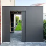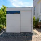 Mit seinen praktischen Maßen nutzt das Gartenhaus den Platz effizient. Eine seitlich laufende Schiebetür mit 110 cm Durchgangsbreite ermöglicht barrierefreien Zugang, ideal für Fahrräder, Polster oder Geräte. Die HPL-Fassade in Charcoal Grey wird von einer robusten Unterkonstruktion aus Fichte getragen. Verglaste Elemente aus Sicherheitsglas bringen Licht ins Innere und machen das kompakte Haus zu einem hochwertigen Stauraum im modernen Look.