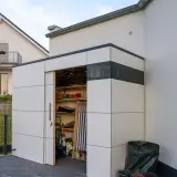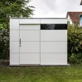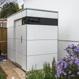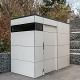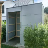Gefertigt aus HPL ist das Gartenhaus auf den dauerhaften Einsatz im Freien ausgelegt – UV-beständig, formstabil und pflegeleicht. Gerade in einer Lage wie Meran mit viel Sonne und wechselnden Witterungen bleibt die anthrazitfarbene Oberfläche langfristig stabil, ohne dass gestrichen oder regelmäßig nachbehandelt werden muss.