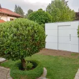 Dieses schmale Gartenhaus in Anthrazit steht in der Nähe von Meran und wandelt eine enge Grundstücksecke geschickt in eine Stauraumfläche um. In einem Umfeld, in dem der Gartenplatz begrenzt ist, war das Ziel, möglichst viel Stauraum zu schaffen, ohne den nutzbaren Außenbereich zu verbauen. Das schmale Gartenhaus schließt bündig an die Grundstücksgrenze an und hält den restlichen Garten offen für Terrasse, Wege und Bepflanzung.