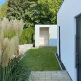 Die Ausführung als Gartenhaus in Anthrazit ist bewusst gewählt: Der dunkle Farbton passt sich herrvoragend in die Umgebung ein und wirkt vor dem Grün des Gartens besonders modern und minimalistisch. So fügt sich das schmale Gartenhaus in Anthrazit wie ein zusätzlicher Baukörper ins Gesamtbild ein, ohne den Außenbereich zu dominieren.
